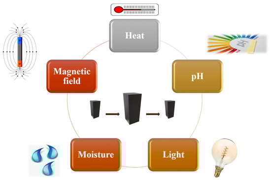 Shape-memory polymers (SMPs) are an emerging class of smart materials that have been widely studied since the 1980s and are capable of recovering their initial shape from a temporary shape through the application of external stimuli: light, temperature, pH, magnetism, electricity, or moisture [,,,], as schematically represented in Figure 1. Furthermore, such materials are able to memorize one temporary shape (two-way SMPs) or several shapes (multi-shape SMPs) [].