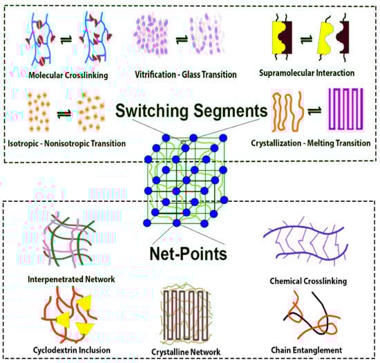 Different transitions may be used to establish the temporary shape, including crystallization/melting transitions, vitrification/glass transitions, liquid crystal anisotropic/isotropic transitions, reversible molecule cross-linking, and supramolecular association/disassociation [] (Figure 2).