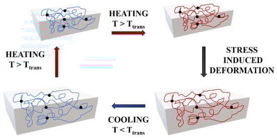 Actually, the most-used SMPs are thermally-induced shape-memory polymers. Their typical mechanism involves heating above a specific temperature, called the transition temperature (Ttrans), which can initiate some of the transformations mentioned above. One of the most-used temperatures is the glass transition temperature (Tg), at which the materials turn from a rigid state to a soft state. This phenomenon occurs due to the increased mobility of the polymeric chains when heating the sample above Tg, and therefore, when an external force is applied, the material can be deformed into a desired temporary shape that corresponds to a change in the molecular conformation and entropy. When cooling below Tg and by gradually removing the external force, the temporary shape can be fixed through freezing the molecular chains and the applied force is stored as entropic energy inside the system. Upon reheating above the Tg, the polymeric chains acquire more mobility, allowing the release of the entropic energy, which is the driving force of the process, and the material is driven back to its entropically favorite state that corresponds to the initial shape [] (Figure 3).