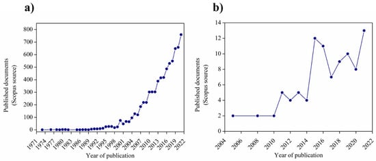 Number of published scientific papers looking for keywords: (a) “shape memory” + “polymers”; (b) “shape memory” + “polymers” + “electrospinning”.