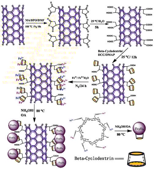 Synthesis of Fe3O4@CD-M nanoparticles. MWNTs were firstly functionalized by grafting maleic anhydride (MA) on their surface through a free radical reaction, subsequently modified by β-cyclodextrin (β-CD), and finally the formation of Fe3O4 nanoparticles by the co-precipitation of Fe2+ and Fe3+ using β-CD as depositional locus [].