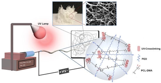 In 2016, Marlettini et al. [] developed an electrospun mat constituted by α,ω-triethoxysilane-terminated PCL to produce beads-free fibers by using electrospinning and sol-gel reaction in order to obtain a material with a high crosslinking degree. The evaluation of the shape-memory properties revealed high values of Rf (100%) and Rr (98%) and the independence of these properties from the content of crosslinking.