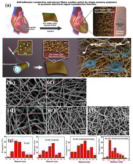 - Feng, J.; Shi, H.; Yang, X.; Xiao, S. Self-Adhesion Conductive Sub-micron Fiber Cardiac Patch from Shape Memory Polymers to Promote Electrical Signal Transduction Function. ACS Appl. Mater. Interfaces 2021, 13, 19593–19602. [Google Scholar] [CrossRef] [PubMed]