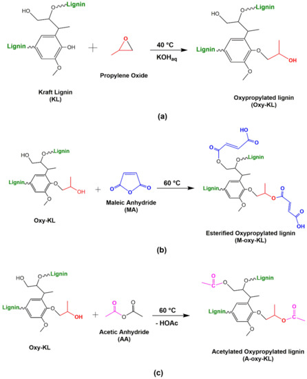 Chemical reactions employed in the lignin modification: (a) Hydroxypropylation with propylene oxide; (b) Esterification with maleic anhydride; and (c) Acetylation with acetic anhydride.