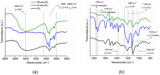 FTIR spectra of KL, M-oxy-KL, and A-oxy-KL are shown in Figure 2 and were normalized with respect to the peak at 1514 cm−1 (C=C aromatic vibration) [20]. Comparing the spectra, some remarkable differences confirmed the successful KL hydroxypropylation: (i) the increase in the peak intensities and the emergence of new peaks in the wavenumber region between 3000 and 2800 cm−1, which are related to asymmetric and symmetrical stretching of CH2 and CH3 groups [11]; (ii) the increase in the intensity of the peak around 1370 cm−1, which is associated with the bending of CH2 and CH3 groups [21]; and (iii) the increase in the peak intensity at 1120 cm−1, which is assigned to stretching of C-O bonds of the ether groups [22].