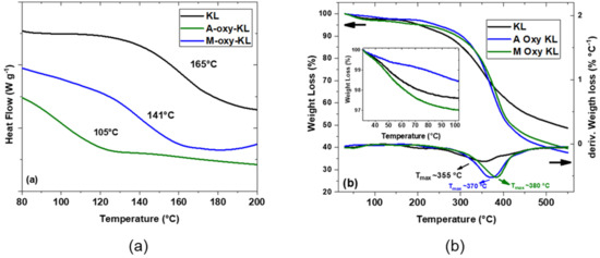 Pristine lignin and its derivatives’ thermal behavior was assessed via DSC analysis to confirm the occurrence of chemical modification. Figure 3a shows the heat flow evolution with temperature for the pristine KL and its derivatives. The glass transition temperature (Tg) was assumed as the peak temperature of the derivative of the heat flow (the curves were omitted for the sake of simplicity). The Tg of KL was estimated at 170 °C, which agrees with the literature that has reported the Tg of lignin ranging from 80 °C to 180 °C, depending on the botanical source and/or extraction method [26]. After chemical modification, there is an evident decrease in Tg that reaches 105 °C for A-oxy-KL and 141 °C for M-oxy-KL. The decrease in the lignin Tg upon chemical modification was expected and has been demonstrated in several works that employed different reaction routes [16,20,27,28,29]. This trend is mainly explained by two mechanisms. The first one is related to the presence of large lateral groups that increase the molecule’s free volume hence decreasing the Tg [30,31]. The second is associated with the effect of chemical modification on intermolecular interactions. After KL hydroxypropylation, the −OH moieties are replaced by large OH-terminated aliphatic branches. After further acetylation with acetic anhydride, these hydroxyls are replaced by acetyl groups (−OCH3), as evidenced by FTIR-ATR analysis. Clearly, acetyl groups possess a lower polarity that weakens the hydrogen bonding network, which severely impacts lignin macromolecular dynamics and, consequently, its Tg [32,33]. On the other hand, maleic anhydride-modified lignin has a carboxyl ending group that presents an intermediate polarity between −OH and −OCH3, and therefore, a less pronounced effect on the intermolecular interaction, yielding a more modest decrease of the Tg compared to pristine lignin.