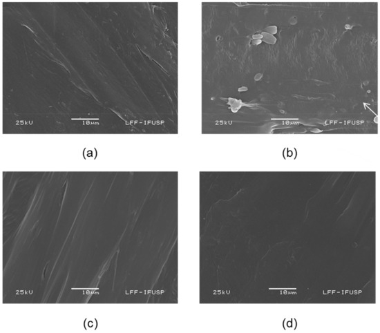 Figure 5 presents the micrographs of pristine PP and PP composites with 5 wt% of lignin. First, the SEM analysis revealed the overall presence of patterns in the cut cross-section of the KL-containing composite, represented in Figure 5b (white arrows). This pattern is quite similar to lignin shape, previously reported elsewhere in KL micrographs [7], and might be related to KL aggregation or phase separation. It is well known that PP and unmodified Kraft lignin are immiscible due to the different natures of both materials, which results in weak dispersion and, consequently, in a heterogeneous morphology with lignin aggregates dispersed in a continuous PP phase [44]. In the literature, besides PP and KL incompatibility, phase separation is usually reported for composites with higher lignin contents (>10 wt%) [45,46]. However, the previously reported results were obtained from different types of PP, lignin, or processing. On the other hand, composites here investigated with modified lignin exhibited no patterns, revealing the absence of lignin aggregation and indicating a better interaction between PP and modified lignins. This result reveals that both chemical modifications improved the compatibility between lignin and the PP matrix. Lignin modification enhances its dispersion into PP due to the inclusion of aliphatic branches and the weakening of intermolecular interactions between lignin molecules (as discussed in the context with DSC analysis). Furthermore, the weakening of intermolecular interactions decreases the tendency of agglomeration [47]. Therefore, a more homogeneous and uniform morphology is expected.
