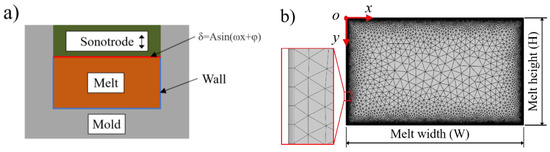 The numerical modeling was realized in a commercial finite element simulation software COMSOL Multiphysics. Assuming that the polymer is completely plasticized, the computational domain of the numerical model is defined as a rectangular chamber, with a motion boundary on the upper side and to introduce ultrasonic vibration and a wall boundary on the other sides, as shown in Figure 1a. The origin is in the upper left corner of the plasticizing chamber, as illustrated in Figure 1b. The motion boundary is defined as a sinusoidal velocity of δ = Asin (ωx + φ) in the vertical direction, and both the motion boundary and the wall have no-slip conditions. The melt width is the same as the diameter of the ultrasonic sonotrode, which is 10 mm. The melt height varies from 2 to 10 mm with a 2 mm step and is related to the material volume and injection time. The trajectory of the fluorescent particles is realized by the particle tracing for fluid flow interface. Quadrilateral and triangular elements were used to mesh the computational domain. Three-layer quadrilateral elements were used to refine the mesh near the motion boundary and the wall, while the triangular elements were used to mesh the rest zones with a curvature factor of 0.3 and a maximum mesh growth rate of 1.3.