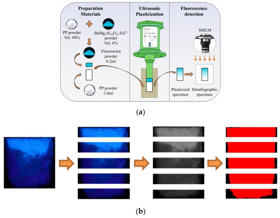 In-house developed UPMIM equipment was used for the ultrasonic plasticization experiments [29]. As shown in Figure 2a, the fluorescent powder was prepared by mixing polypropylene (94% vol) with barium magnesium aluminate (6% vol) for 30 min under oscillating conditions. Next, 1.0 mL of PP powder was placed and compressed in the plasticizing chamber (NAK80 mold steel, 10 mm diameter, and 0–30 mm adjustable height), followed by 0.2 mL of fluorescent powder evenly placed and compressed on top. The ultrasonic vibration energy was subsequently introduced into the plasticizing chamber to fabricate plasticized fluorescent specimens, with an applied ultrasonic amplitude ranging from 56 to 72 μm. The plasticizing pressure, ultrasonic vibration time, holding pressure and holding time were all kept constant at 20 Mpa, 6 s, 20 Mpa, 6 s, respectively. After cutting and grinding, the fluorescence intensity distribution of the fluorescent specimens were analyzed using an optical microscope (VHX-5000, KEYENCE, Osaka, Japan) to investigate the acoustic streaming driven mixing characteristics during ultrasonic plasticization. ImageJ was used to quantify the fluorescence intensity by the gray value of the picture. In more detail, the fluorescence image was cut into pieces in every 2 mm from the top to the bottom. A single channel of the image was extracted and the format was converted to 8-bit grayscale. The threshold function was used to set the grayscale ranging from 5 to 255 to select all fluorescent areas, as illustrated in Figure 2b.