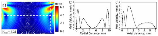 Figure 3 shows the melt stream velocity distribution in the plasticizing chamber under the control parameters. The ultrasonic vibration induced melt disturbance, resulting in the formation of four vortices in the plasticizing chamber (i.e., two small flattened vortices near the end surface of the ultrasonic sonotrode, and two larger and nearly circular vortices near the side wall, all symmetrical along the center axis. Two dashed reference lines were drawn in the center of the larger vortex to quantify the effect of position on the melt stream velocity, as indicated in Figure 3a. The relationship between stream velocity and the position is shown in Figure 3b,c. The melt stream velocity was symmetrical along the central axis. Three minimal stream velocity locations arose in the radial direction: the left main vortex center, the center axis, and the right main vortex center, as shown in Figure 3b. With a maximum flow velocity of 6.21 mm/s, the melt flows around the vortex’s center, resulting in a rather high stream velocity around the vortex’s center, as shown in Figure 3c.