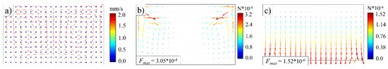 The fluorescent particles of barium magnesium aluminate were seeded uniformly in the model at 0.5 mm intervals to investigate the total force that the acoustic streaming generated during ultrasonic plasticizing, as illustrated in Figure 4a. The total force of the fluorescent particles comprises the acoustic radiation force and the Stokes drag force. The acoustic radiation force can be related to the acoustic pressure difference along the axial direction, and the Stokes drag force is related to the velocity difference between the melt stream and the fluorescent particles. The Stokes drag force distribution under control parameters is comparable to the stream velocity, with a maximum value of 3.05 × 104 N near the vortex, as indicated in Figure 4b. The acoustic radiation force is positively associated with the distance from the top end, with a maximum value of 1.52 × 106 N near the bottom end, as demonstrated in Figure 4c. The Stokes drag force is two orders of magnitude of the acoustic radiation force. Hence, the total force is approximately equal to the Stokes drag force.