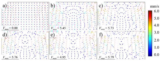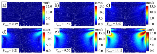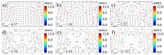Figure 8. Melt stream velocity distribution under various ultrasonic amplitudes (ultrasonic frequency, 20 kHz): (a) 20 μm; (b) 40 μm; (c) 60 μm; (d) 80 μm; (e) 100 μm; (f) 120 μm.