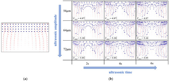 Fluorescent particles were evenly seeded in an area with a height of 2 mm in the upper section of the plasticizing chamber to investigate the acoustic streaming driven mixing effect, as shown in Figure 6a. The fluorescent particle’s trajectory in numerical simulation at various ultrasonic action time applying the ultrasonic amplitudes of 56, 64, and 72 μm, respectively, as illustrated in Figure 6b. The maximum velocity of the particles increased with increasing ultrasonic amplitude, and the initial acceleration of the particle can be finished in 2 s. The maximum velocity of the particles increased from 4.87 mm/s to 5.95 mm/s when the amplitude increased from 56 μm to 72 μm. The trace of the particle was identical at each ultrasonic amplitude, and all of them rotated around the vortex center. The two small flattened vortices near the end surface of the ultrasonic sonotrode and two larger and nearly circular vortices near the side wall work together to achieve particle mixing. Because the ultrasonic amplitude and action time are proportional to the trace length, particle diffusion rates could be improved by increasing the ultrasonic amplitude and action time.