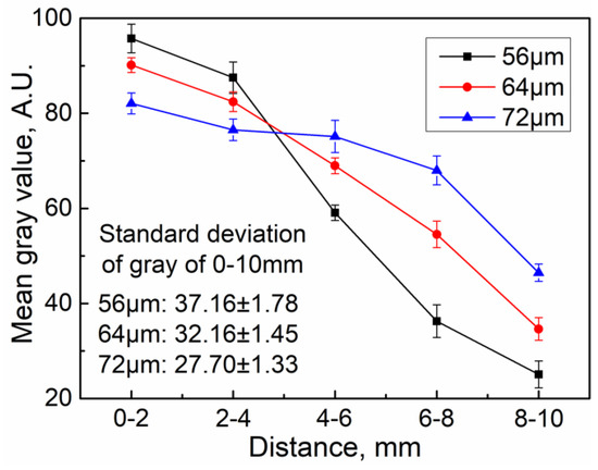 Figure 7 shows the influence of the ultrasonic amplitude on the gray value of the ultrasonic plasticized fluorescent specimens in the experimentation. According to our previous investigation [10,11,12], the heat generation rate during ultrasonic plasticizing is significantly influenced by the ultrasonic amplitude. The higher the ultrasonic amplitude, the faster the heat generation rate. Since the heat generation among the particle interfaces lasts only several tens of milliseconds due to the interfacial friction heating, the heat generation with increased ultrasonic amplitude are mainly attributed to the volumetric viscous heating. The difference in the mean gray value of the specimen was the largest when the ultrasonic amplitude was 56 μm. This may be related to the lower heat generation rate during ultrasonic plasticizing, and the melting of the materials is limited, resulting in a poor fluorescent powder diffusion. The difference in the mean gray values became smaller when the amplitude was increased to 72 μm. The polymer heat generation rate is faster at higher amplitudes, leading to an accelerated ultrasonic plasticizing and more melt generation. This further leads to a wider spectrum of fluorescent powder motion along with the melt and a prolonged acoustic streaming driven mixing. Moreover, the improved acoustic streaming driven mixing at increased ultrasonic amplitudes can also be validated by the standard deviation of the mean gray value. The standard deviation of the mean gray value fell from 37.1 to 27.7 when the ultrasonic amplitude was increased from 56 μm to 72 μm. This further verified the numerical simulation results that the fluorescent particles travel faster and further with increased ultrasonic amplitudes, as demonstrated in Figure 6b. Therefore, both the finite element simulation and experimental data illustrate the positive correlation between the diffusion performance of the fluorescent powder and the ultrasonic amplitude. Furthermore, it implies that there is indeed acoustic driven mixing during ultrasonic plasticizing, which could be a comparable but more efficient and energy saving mixing concept than traditional screw-based shear stirring. It should be noted that specimens plasticized at higher amplitudes than 72 μm were not available with the present experimental setup because it may cause cracking of the ultrasonic sonotrode and shift of the resonant frequency.