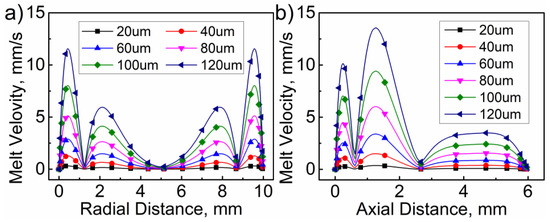 Figure 9. Influence of ultrasonic amplitude on the melt stream velocity in (a) radial and (b) axial directions.