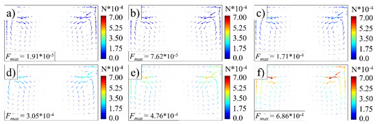 As discussed in Section 4.1, the total force is approximately equal to the Stokes drag force, which is linearly related to the velocity difference between the melt and the fluorescent particles, according to Equation (14). The melt stream velocity can be increased exponentially with increasing ultrasonic amplitude, as demonstrated in Figure 8. Therefore, it can be drawn that the total force can also be changed exponentially with increasing ultrasonic amplitude. This is indeed the case, as we found in the numerical simulation. The maximum value of the total force increased from 1.91 × 10−5 N to 6.86 × 10−5 N while maintaining the distribution pattern when the ultrasonic amplitude increased from 20 μm to 120 μm, as illustrated in Figure 10.