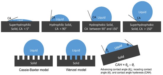 The term hydrophobicity refers to poor wettability characterized by surface free energies as low as 5–50 mN m−2 []. In comparison, superhydrophilicity denotes wettability to surfaces with high surface free energies of 500–5000 mN m−2 []. The contact angle (CA), the angle between the liquid–vapor interface and outline of the contact surface, is a good measurement of hydrophobicity/hydrophilicity. Generally, solid surfaces that have contact angles ≤90° are considered hydrophilic, while those having contact angles ≥90° are considered hydrophobic. A superhydrophobic surface has a contact angle ≥150° [,,]. Surface energy is a critical factor in achieving superhydrophobicity; it can be lowered by chemically manipulating the composition of materials or coating them with thin films. Another way to lower the surface energy is to generate micro-surface or nano-surface structures in order to change the roughness and cause Cassie–Baxter or Wenzel effects. The Wenzel equation is shown below: