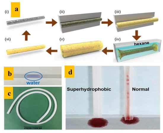 Fabrication process of the superhydrophobic PDMS tube reported by Kim et al. [] (a) Schematic diagram of the replication and detachment process of the superhydrophobic tube, (b) optical image of the fabricated tube, (c) photograph of the tube showing its flexibility, (d) superhydrophobic tube and the normal tube after blood was transferred through the tubes.