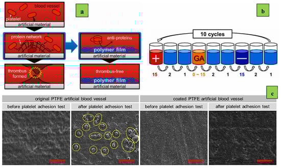 Schematics of (a) simplified thrombus formation; (b) the process of layer-by-layer self-assembly in the present study; (c) scanning electron microscopy [] images of an uncoated original and a coated PTFE artificial blood vessel before and after the platelet adhesion test. Research was carried out by Kengo Manabe and Hidefumi Nara [].