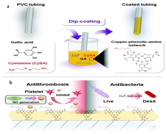 Scheme of the surface preparation by dual-function CuII–GA/CySA coating reported by Tu and others []. (a) Scheme of preparation of the dual-function coating by dip-coating via metal–phenolic–amine surface chemistry; (b) surface coating with a copper–phenolic–amine network that can confer the PVC tubing with dual long-term antithrombotic and antibacterial properties.