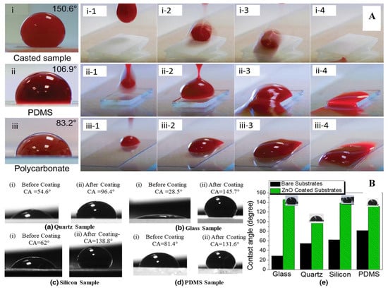 (A) Blood-repelling properties of the sand-casted superhydrophobic sample compared with common materials, and blood rolling off the samples: (i) superhydrophobic sample, (ii) PDMS, (iii) polycarbonate; research by Li et al. []; (B) contact angle measurements on various substrates before and after ZnO nanowire coating application; reported by Singh, A. and S. Singh [].