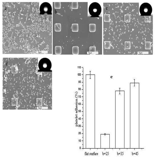SEM of platelets adhesion to (a) a flat substrate; (b–d) superhydrophobic surfaces with micro-pillars; (e) platelet adhesion on different surfaces along with percentage of adsorption onto a flat surface. Width a =10 μm, height h = 5 μm, with spacings b = 25 μm, 35 μm, and 45 μm, respectively, reported by Zhou, M., et al. [].