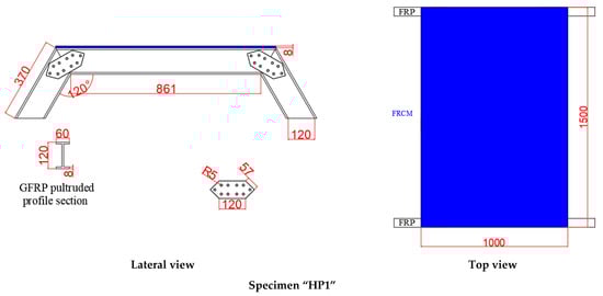 Figure 2). For testing specimen HP1, a hydraulic actuator (200 kN force range) was used to apply the displacement at the midspan of the FRCM plate at a rate of 1 mm/min. This action was distributed along the width of the specimen with a loading beam (HEM 200) that had an aluminum profile and a bar under it so as to concentrate the applied load in a line that was precisely placed at the desired position (see