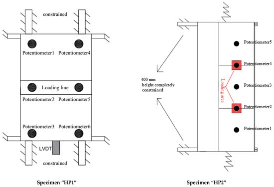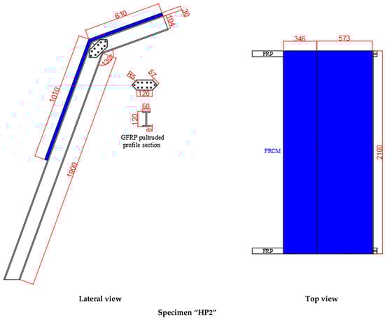 Specimen HP2 was completely fixed at the lower part of the vertical-like GFRP profiles by bolting them to the external loading frame. In addition, the horizontal-like GFRP profiles were horizontally and vertically restrained with steel chains (see the sketch in