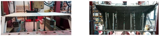 Figure 2). The load was applied indirectly as an imposed displacement at two 150 mm square areas located three-thirds of the way down the length and transversal midspan of the top FRCM plate. This displacement was manually applied through tensioners that act on steel plates placed at the extrados of the structure. These tensioners were fixed to a reaction beam of the rigid loading frame through hinges. The direction of the applied displacement/load was orthogonal to the top FRCM plate. The applied load at both areas was simultaneously measured (load cells in the 10 kN range), recorded, and manually balanced by alternating the tensioners to be activated. Five potentiometers (10 cm range and 0.02% accuracy) were placed in line at a sixth of the length of the specimen, all at the same distance from each other. The 2nd and 4th potentiometers were placed as close as possible to the load application position. All potentiometers measured the vertical displacement.