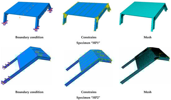 Figure 4). Simplified cylindrical parts were set to model bolts in the HP1 case. Nuts and washers were not represented. According to the experimental and numerical results of the HP1 case (see