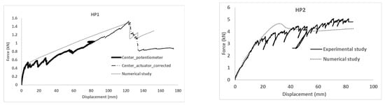 Figure 5, where the overlapping with experimental results can be observed. For both specimens, HP1 and HP2, the proposed numerical model successfully predicted the mechanical response of the experimental tests in terms of initial stiffness and maximum load.