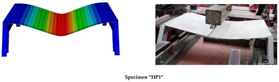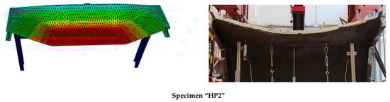 Analyzing the HP2 case, it was observed that the model reproduced the deformation at maximum load, although experimental observations indicated a more evident plate-like response between the load application areas describing a parabola, whereas the numerical model predicted a flatter shape (