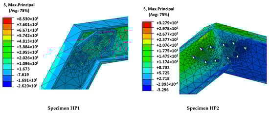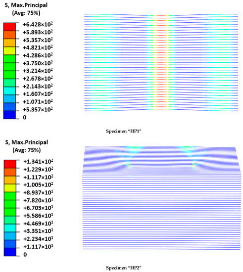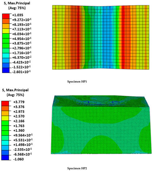 Figure 6), it was clear that the FRCM behaved as a membrane in the last part of the experiment and the FRP-FRCM connections acted as hinges. The membrane response was also modeled by the simulation through a more concentrated deformation describing a sharper shape than the typical parabolic flexural one expected for plates. Regarding the calculated maximum principal stresses, it is clear that for the maximum load, the mortar around the loading edge in HP1 had failed (see