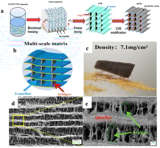 A biomimetic highly compressive and hydrophobic graphene/polyvinyl alcohol/cellulose nanofiber aerogel with unique three-dimensional (3D) interconnected lamellar layers with bridges was successfully prepared through bidirectional freezing. Long carbon chains were grafted to the surface of GTPA, which yielded the modified GTPA (MGTPA) hydrophobicity (WCA = 134°) through CVD modification.