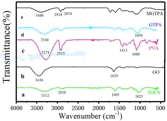 The FTIR spectra of the (a) TOCN, (b) GO, (c) PVA, (d) GPTA, and (e) MGPTA.