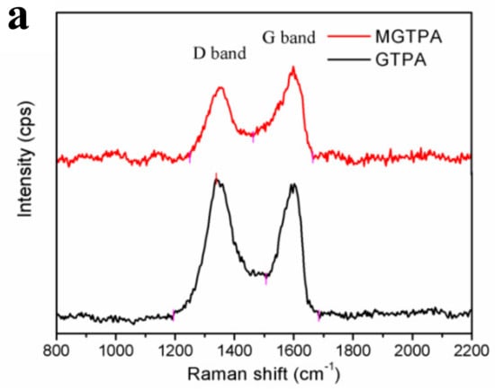 To investigate the chemical structure and CVD modification efficiency of MGTPA, FTIR spectroscopy, Raman spectroscopy tests, and XPS were used. The FTIR spectra of the TOCN, GO, PVA, GPTA, and MGPTA are shown in Figure 2. The spectrum of TOCN (Figure 2a) shows that the absorption peaks at 3312 cm−1, 1605 cm−1, and 1023 cm−1 are attributed to the stretching and bending vibrations of -OH and glycosidic ring vibration, respectively [26], while the vibration at 2910 cm−1 corresponds to the stretching vibration of -CH. The spectrum of GO (Figure 2b) occurring at 3436 cm−1 and 1629 cm−1 corresponds to -OH stretching vibrations and the C=C from an aromatic ring, respectively [27]. The peaks of the PVA (Figure 2c) infrared spectra at 2923 cm−1 were associated with the stretching of -CH. The strong absorption peaks at 3280 cm−1, 1413 cm−1, and 1080 cm−1 are characteristic peaks of hydroxyl groups caused by O–H stretching vibration, in-plane bending vibration of CH–OH, and stretching vibration of C–O, respectively. The spectrum of GPTA (Figure 2d) showed similar characteristic peaks, but showed a slightly weakened peak value, indicating the strong interface interaction between the three components of TOCN, PVA, and GO. The weakness of the peak at 3359 cm−1 revealed that the compatibility of the GA and PVA chains led to a decrease in the number of free hydroxyl groups, which may indicate the formation of acetal bridges and the completion of acetal reactions [28].
