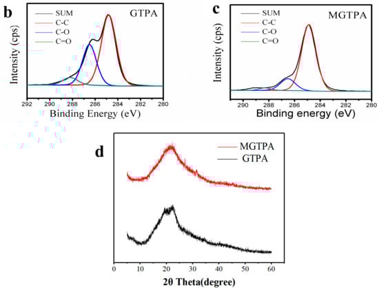 (a) Raman spectra of MGTPA and GTPA. XPS high-resolution C1s scans of (b) GTPA and (c) MGTPA. (d) XRD patterns of GTPA and MGTPA.