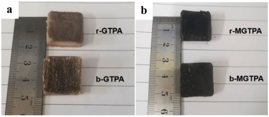 (a) Photograph of r-GTPA and b-GTPA. (b) Photograph of r-MGTPA and b-MGTPA.
