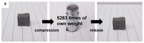 Mechanical properties, especially reversible compressibility, are particularly important for the evaluation of adsorbed materials to obtain a high oil-recovery rate from squeezing. To evaluate the mechanical properties of MGTPA, a series of compression tests were performed. Figure 5a shows a typical photograph of b-MGTPA, which can withstand pressures more than 5000 times its own weight (where it is compressed to 5% of the original height). After the load is removed, the b-MGTPA can quickly return to its initial height without any damage, and the structure exhibits a high compression resilience and suffers no obvious lateral deformation in the process of compression.