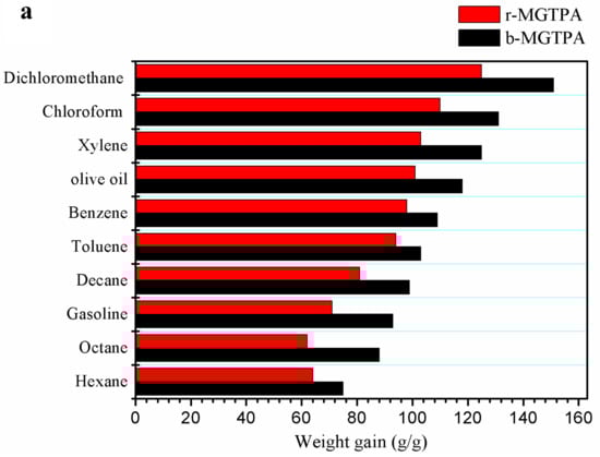 Due to it low density, high compressive, and high porosity, MGTPA has great application prospects for absorbing oil and organic pollutants. In order to systematically study the absorption capacity of MGTPA, MGTPA was used for the saturated absorption of various oils and organic solvents, such as hexane, olive oil, toluene, and some common pollutants and leaks in daily life or in the chemical industry. As shown in Figure 7a, the saturated absorption capacity of b-MG20TPA varies from 75 to 151 times its own weight for various oils, depending on the density, viscosity, and surface tension of the absorbed oil. In addition, biomimetic structures have a better oil adsorption performance than random structures, which may be due to the fact that the unique mineral bridge structure can provide greater space for oil absorption.