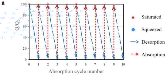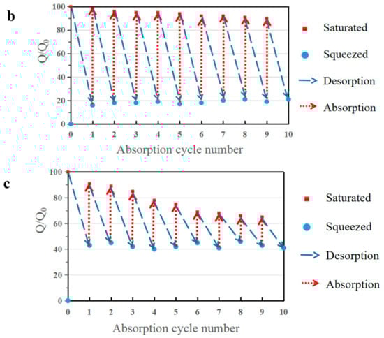 As a comprehensive and suitable oil–water separation and absorption material, Absorbent can not only effectively separate oil and water from an oil–water mixture, but it can also efficiently recycle the absorbed organic solvent. The reusability and oil recovery of adsorbent materials are a significant standard for evaluating the application of adsorbent materials. In this work, b-MGTPA proved to have excellent hydrophobic properties and compressibility, which grants it two methods to recycle absorbed oil or organic solvent in actual oil–water separations according to different practical needs. First, when dealing with low boiling point oils, such as hexane or toluene, the absorption/distillation cycle is an option. Saturated b-MGTPA is heated to near the boiling point of the solvent to release the absorbed oil, and the oil can be recovered by collecting the evaporating oil vapor. This kind of recycling efficiency is very high, and can basically achieve a 98% recycling rate after 10 cycles of absorption and desorption (Figure 8a).