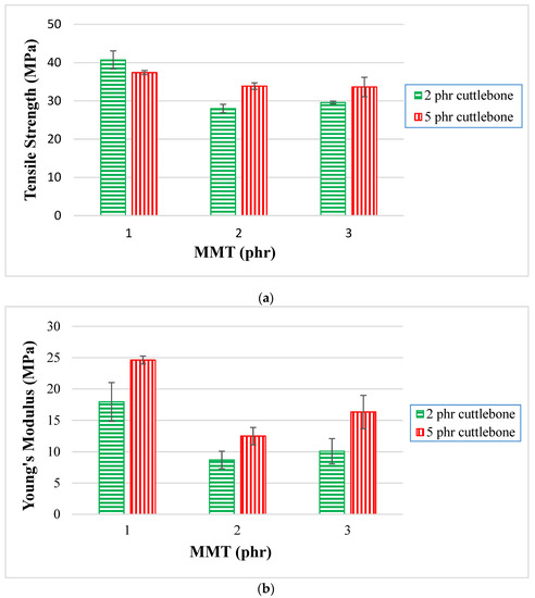 For quantitative analysis, the enthalpy of melting (∆HM) extracted from the data are tabulated and plotted in Figure 4. When there was an increment of MMT from 1 phr to 2 phr for all fixed loading levels of cuttlebone (2 and 5 phr), the enthalpy of melting decreased. This is because the interaction effect of MMT and polymer matrix was reduced, whereas when there was an increasing amount of MMT from 2 phr to 3 phr for fixed 2 and 5 phr loading levels of cuttlebone, the enthalpy of melting was shown to increase. This is because inorganic layers of MMT promoted a new crystal structure, leading to better thermal properties. The stiffening behavior of MMT also improved the crystallinity of PVOH-calcined cuttlebone-MMT nanocomposites. In fact, MMT tended to enhance the reinforcing effect through physical interaction, such as intercalation and exfoliation effects, to boost the mechanical strength of the composites [23]. The interaction of MMT and calcined cuttlebone became intense when blended with PVOH. The addition of MMT at higher amounts helped to recover the strong interaction in PVOH-calcined cuttlebone blends. Both reinforcing fillers were well dispersed in the PVOH matrix. Similarly, this was evidently shown when the tensile strength for PVOH blends with 3 phr MMT and 2 phr calcined cuttlebone were higher than the PVOH blends with 2 phr MMT and 2 phr cuttlebone. Moreover, according to Young’s modulus data, PVOH blends with 3 phr MMT and 2 phr cuttlebone had higher rigidity with an increment of 16.24% when compared with PVOH blends with 2 phr MMT and 2 phr cuttlebone.