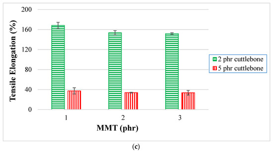 Moreover, Figure 1c presents tensile elongation at various loading levels of MMT, ranging from 1 phr to 3 phr added into PVOH with fixed 2 phr and 5 phr of cuttlebone. When the cuttlebone was fixed at 2 phr, the tensile elongation decreased gradually, which was caused by the agglomeration of the high loading level of MMT. Thus, it can be seen that MMT was unable to be distributed evenly in the PVOH matrix, eventually causing the region stress concentration to become more pronounced in the polymer matrix. An irregular matrix chain was also produced as the formed clusters MMT prevented the smooth flow of PVOH. The addition of MMT might increase the brittleness of polymer blends, contributing to the reduction of the ability to deform before fracture. This resulted in lower elongation at break, as the recrystallization was restricted during deformation. It could be observed that the highest tensile elongation was at 100 phr PVOH-2 phr calcined cuttlebone-1 phr MMT composite due to the high strain at its breaking point. The observation for fixed 5 phr calcined cuttlebone was similar with the previous observation when the calcined cuttlebone was fixed at 2 phr. This is shown when the percentage tensile elongation graph shows a downward trend for all fixed loading levels of MMT. Additionally, the tensile elongation for nanocomposites with loading level of 5 phr calcined cuttlebone is consistently lower that that with 2 phr of cuttlebone. This is because the increased amount of calcined cuttlebone would induce poor dispersion of cuttlebone particles on the PVOH matrix due to the aggregation of calcined cuttlebone particles. Additionally, more stress concentration region was formed along the calcined cuttlebone particles leading to the reduction of chain sliding ability. The reinforcing effect of calcined cuttlebone was insignificant, whereas the polymer ductility was reduced and caused the elongation to drop dramatically. Overall, only a small amount MMT and calcined cuttlebone fillers was required to exhibit a good reinforcing effect to the PVOH matrix, as elongation at break obviously exhibited the highest result at the nanocomposite incorporated with PVOH, 1 phr MMT, and 2 phr calcined cuttlebone. To test the tensile elongation of the polymer chain, the chain was pulled with a hook, thus extending the length of the PVOH chain and increasing the elongation of the polymer composites.