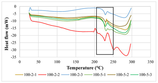 DSC thermogram of PVOH-calcined cuttlebone-MMT composites. Note: 100-2-1 denotes 100 phr PVOH added with 2 phr cuttlebone and 1 phr MMT.