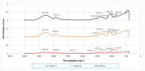 Infrared spectrum of PVOH-MMT nanocomposites added with 2 phr of calcined cuttlebone. Note: 100-2-1 denotes 100 phr PVOH added with 2 phr cuttlebone and 1 phr MMT.