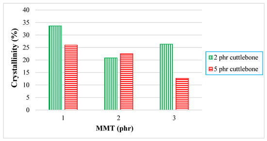 By referring to Figure 8, for 2 phr of cuttlebone loading, the crystallinity of composites was slightly decreased from 33.65% to 20.82%, and then increased to 26.33% when the various loading levels of MMT were added into the PVOH matrix. This decrement identified that the addition of MMT could slightly disrupt the arrangement of the crystal structure in the PVOH matrix. For example, it could rupture the orientation of the crystalline structure in the polymer matrix of PVOH composites. Additionally, there could be non-homogeneous distribution of MMT, which prevents the MMT particles from getting into the PVOH-cuttlebone blends. When the regularity of the matrix chain arrangement was reduced, this resulted in transformation of the structure from crystallite to amorphous and thus reduced the crystallinity. Moreover, the increased crystallinity indicated that the fillers exhibited good interaction with the polymer matrix, inducing the formation of more crystallite structure. This is because calcined cuttlebone and MMT have hydrophilic characteristics and contain formed hydroxyl groups. They tended to form new hydrogen bonds with the polymer matrix, inducing the formation of new crystallites, which resulted in a more orderly chain arrangement. These results were in agreement with the tensile strength test. Furthermore, when the loading level of cuttlebone increased, the crystallinity decreased. This is due to the agglomeration of cuttlebone in the PVOH matrix, causing the decrease of interfacial adhesion to occur. Thus, no new bond or crystalline structure would be formed. It could be observed that the mechanisms for addition of MMT and calcined cuttlebone on polymer blends are analogous, leading to similar trends for d-spacing as well as the tensile strength test.