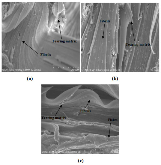 Moreover, less agglomerates can be seen in Figure 9c, confirming that the tensile strength for 3 phr MMT with PVOH-calcined cuttlebone blends was higher than 2 phr MMT with PVOH-calcined cuttlebone blends. There was only slight aggregation where the effect was insignificant. The superior properties overrode the inferior properties, contributing to the good continuity of macromolecule chains. At fixed 5 phr calcined cuttlebone, when the amount of MMT was at 1 phr, the continuity of the matrix was smooth, as seen in Figure 10a. However, when the amount of MMT increased to 2 phr and 3 phr, distinct characteristics on the composites could be observed, such as tearing matrix, flake-like structure, and fibrils exhibited on the surface of composites, as shown in Figure 10b,c. As a result, the structures of nanocomposites were slightly changed, especially for 3 phr MMT incorporated PVOH-cuttlebone blend (Figure 10c). The brittleness effect increased and caused the nanocomposites to break faster when high stress was applied. Therefore, they eventually provided low tensile strength and elongation.