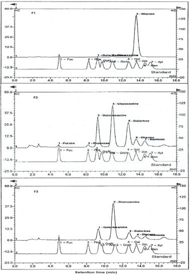 Neutral and amino sugar contents of the eluted fractions (F1, F2, F3) from the ion-exchange chromatography were analyzed using HPAEC-PAD System (Dionex Co., Bannockburn, IL, USA). Sample solutions (10 µL) of the fractions were passed through CarboPac PA-1 column (4.5 × 250 mm, Dionex Co., Bannockburn, IL, USA) and eluted with isocratic gradient of 18 mM NaOH at a flow rate of 1 mL/min, for neutral sugars. HPAEC-PAD experiments were performed in triplicate for each sample. Reference standard solutions were analyzed in duplicate for the standard curve. Good standard curve linearity was observed (r ≥ 0.990) [20].