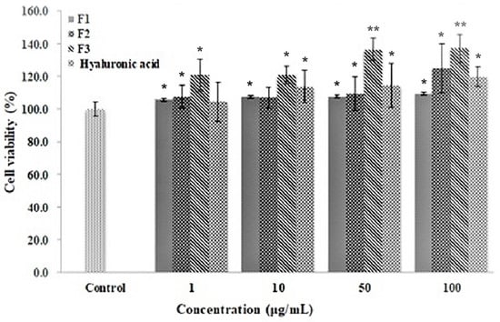 HFDP cells were cultured in follicle dermal papilla cell growth medium (PromoCell GmbH, Heidelberg, Germany) containing 10% FBS, 50 units/mL of penicillin and 50 mg/mL of streptomycin. HFDP cells were distributed at a concentration of 1 × 104 cells/well to a 96-well plate and cultivated in a CO2 incubator adjusted to 37 °C with 95% humidity and 5% CO2. For cell viability, cells were treated with F1, F2, F3 (1, 10, 50 and 100 μg/mL) and hyaluronic acid (1 μg/mL) for 24 h. MTS solution (0.5 mg/mL, CellTiter 96® Aqueous One Solution Cell Proliferation Assay kit) was added to each well for 4 h (5% CO2 at 37 °C), and 100 μL of DMSO was added to solubilize purple formazan crystals. The mixed samples (F2 + F3 fraction, FFM) were dissolved in the new growth medium so that the final concentration was 1, 10, 50 and 100 μg/mL, followed by treatment with cytoplasm, and cultivation for five days. The proliferation rate of cells was measured using the Cell Titer 96® Aqueous One Solution Cell Proliferation Assay purchased from Promega Co. (Madison, WI, USA). The absorbance was measured at 490 nm using the Spectramax M2 Microplate Reader (Molecular Devices, Sunnyvale, CA, USA) [22].