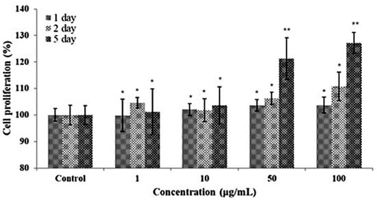 The effect of each ascidian tunic GAGs fraction on the viability of HFDP cells was monitored during a period of 24 h (Figure 2). HFDP cells were with each of the tunic fractions at 1, 10, 50 and 100 μg/mL and compared to the cell-only negative control and to the cells treated with the positive control, hyaluronic acid. After treatment, all fractions did not show toxicity on HFDP cells and cell viability was significantly higher than the control groups in the cells treated with F3 fraction at 50 and 100 μg/mL concentrations. The results indicated the potential of ascidian tunic GAGs extract to promote cell proliferation. Thus, F2 and F3 were combined (FFM) and further examined for proliferative activity on HFDP cells. After 5 days of culture, notable increases in proliferation were observed in cells treated with 50 and 100 μg/mL FFM (21% and 27%, respectively, as shown in Figure 3). This showed that FFM from ascidian tunics promoted cell proliferation, which could also suggest a potential to promote hair growth.